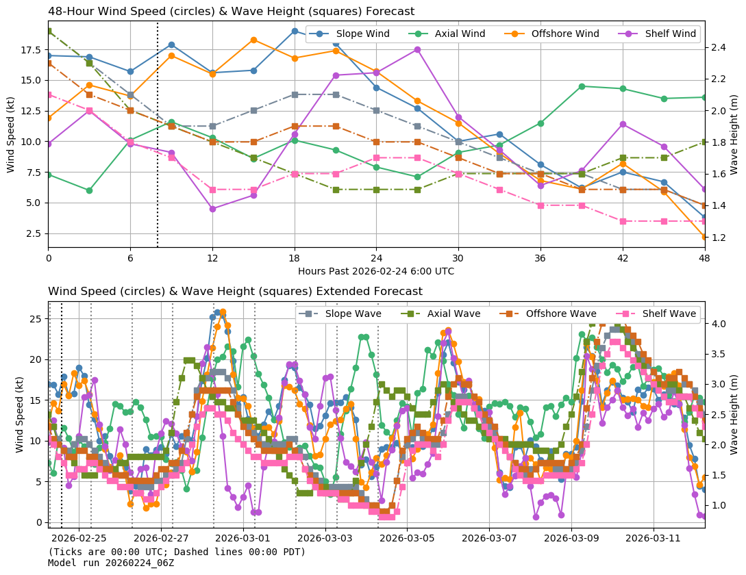 Above: 48-hour and extended wind and wave forecasts for the main RCA sites relative to the most recent GFS and WWIII model runs. Below: wind and wave forecasts for older model runs. To view older forecasts and raw textual data visit the Wind and Wave Data Archive.