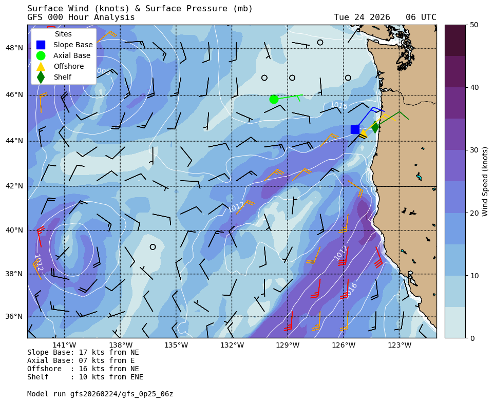 The image below shows a map of surface wind speed (coloring), wind speed vectors (barbs), and surface pressure (white contours; labeled) for the 000-hour analysis of the most recently published NOAA/NCEP Global Forecast System weather forecast. The main RCA sites are superimposed (see legend), and a wind barb indicating the wind speed and direction from the nearest model grid point to each site is placed at the location of the site. In most cases, the distance between a site and its nearest model grid point is less than 6 nautical miles). Wind barbs indicating wind speeds between 20-25 knots are shown in orange, while winds over 25 knots are shown with red barbs (to indicate less than ideal conditions).