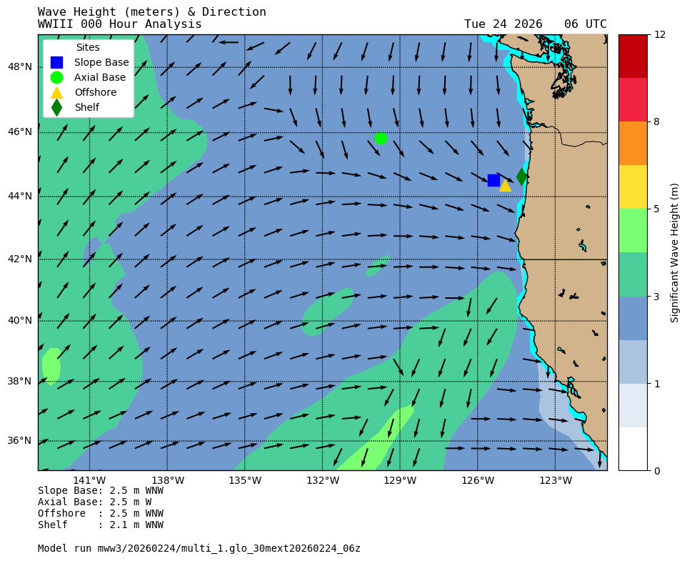 The image below shows a map of significant wave height (coloring) and primary wave direction vectors (arrows; not scaled) for the 000-hour analysis of the most recently published WaveWatch-III wave forecast. The main RCA sites are superimposed (see legend). Wave height and direction at the nearest grid point to each RSN site is displayed in the lower left below the plot. In most cases the distance between a site and its nearest model grid point is less than 6 nautical miles.
